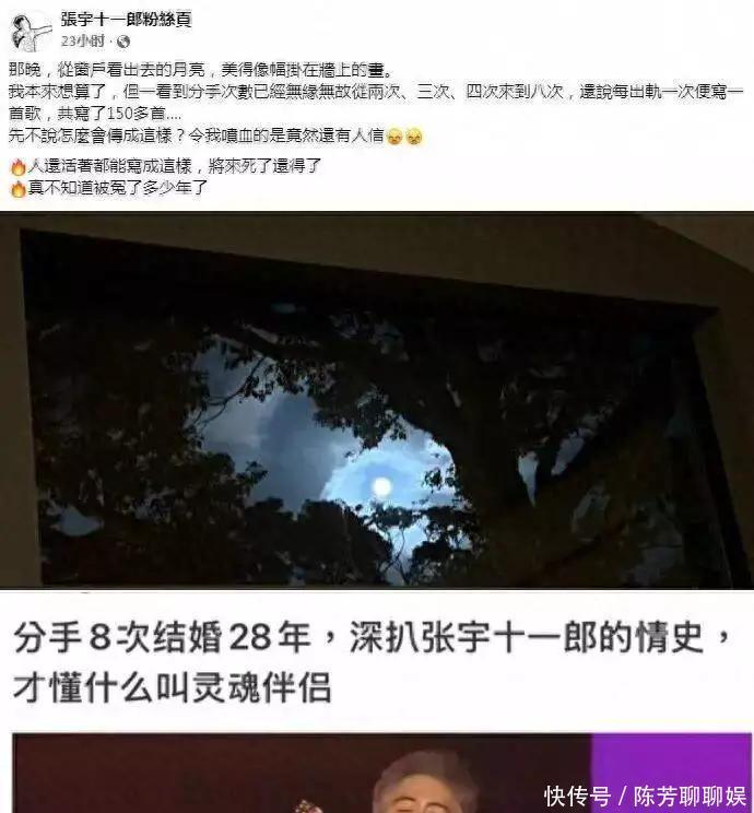 娱乐圈“神仙眷侣”张宇和十一郎,这对从校园走到婚纱的乐坛传奇,近日竟被离谱谣言逼到亲自下场辟谣!10月23日,两人罕见在社交平台同步发文,痛诉常年遭网络谣言“魔改人生”:“分手次数从两次一路狂飙到八次,连‘每出轨一次就写一首歌’的狗血剧本都编出来了!”十一郎无奈直呼:“人还活着都能写成这样,将来死了还得了?”字里行间尽显哭笑不得的愤慨。